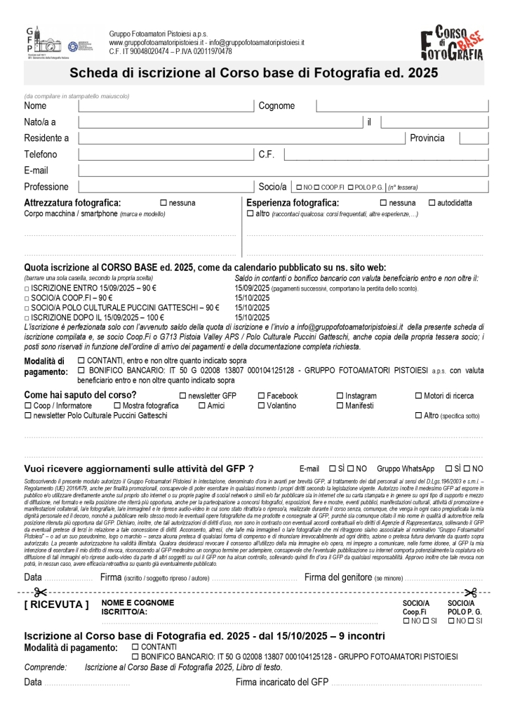Per iscriversi al corso è sufficiente compilare la scheda di adesione allegata (clicca sull'immagine sotto o sull'allegato in fondo alla pagina) e portarla alla sede del GFP (Dove siamo) il martedì sera dalle ore 21,30 in poi, pagando la quota di adesione o portando la contabile del bonifico svolto.
